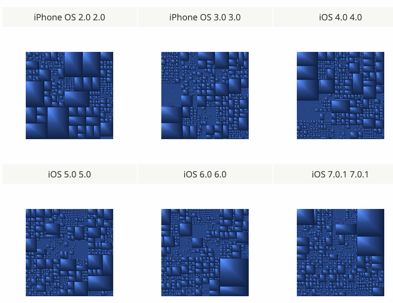 大家可能都忘了最初的iOS是啥样了,如果把iOS各个系统文件拆一下,会是怎样的体验?今天我们就来扒一下iOS的演进史,不过,我们是从一个奇怪的角度,矩阵树图!What?2G的iPhone,发短信的年代回来了?如果透视下文件大小,初代iPhone就长下面这样。可以看到,iOS刚开始跟macOS差不多,框架占用了超过三分之一的大小,而字体竟然占了25%!可以看到UIkit占总体大小的13% 以上, 墙纸和手机铃声占6%, ICU 需要超过5%,SpringBoard大约是2%。字体块由两部分组成:字体本身占了2/3,缓存区占了1/3。那我们看看乔布斯,都在 iPhone OS 1.0中内置了哪些字体:好像都不太熟,就一个Arial还勉强见过。好,我们快进一下。